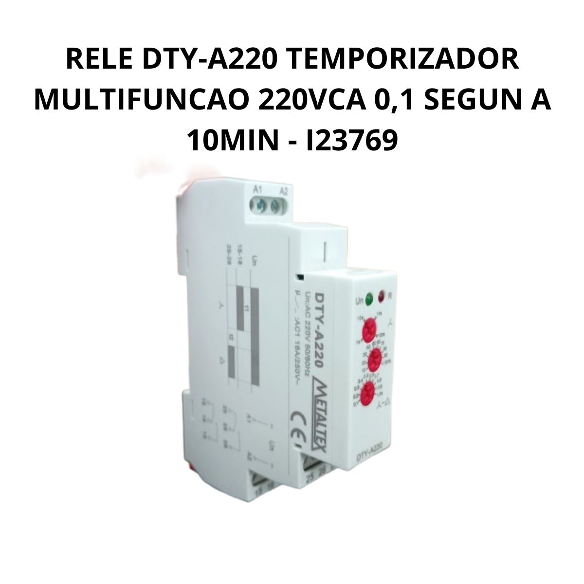 Temporizador analógico com função de partida estrela-triângulo. Possui tempo de atraso de 0,1 seg a 10min, tempo de chaveamento de 0,1 a 1seg, 2 saídas a relé reversíveis de 16A-AC1 e tensão de alimentação de 220VCA. De acordo com as normas IEC61812-1 e IEC61010-1. Fixação em trilho DIN.